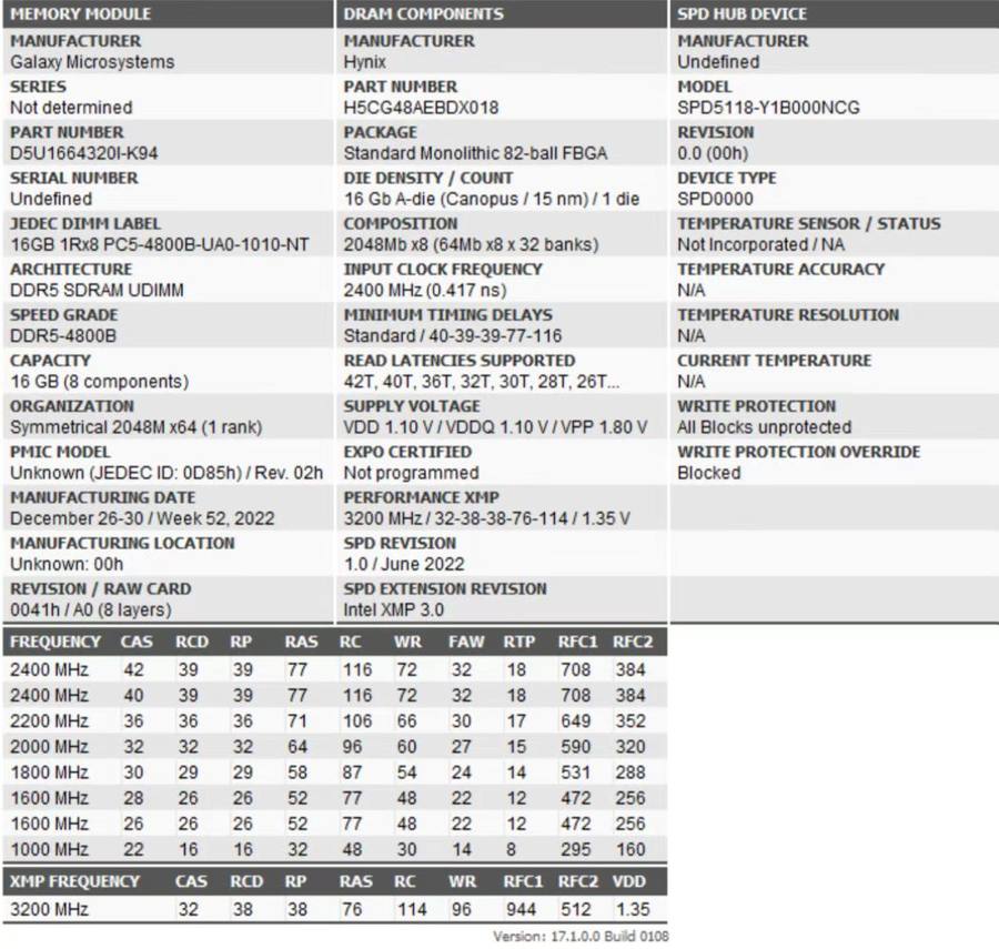 根据Thaiphoon Burner 软件识别的信息,这款内存芯片的供应商为海力士,芯片编号为H5CG48AEBDX018,按照命名规则第七位字母A代表其为海力士A-Die。