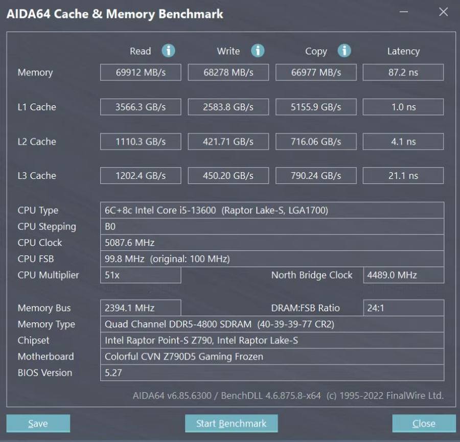 这次测试使用的是英特尔酷睿i5-13600K处理器,主板搭配七彩虹CVN Z790D5 Gaming Frozen,下面将会对影驰星曜DDR5-6400进行测试。