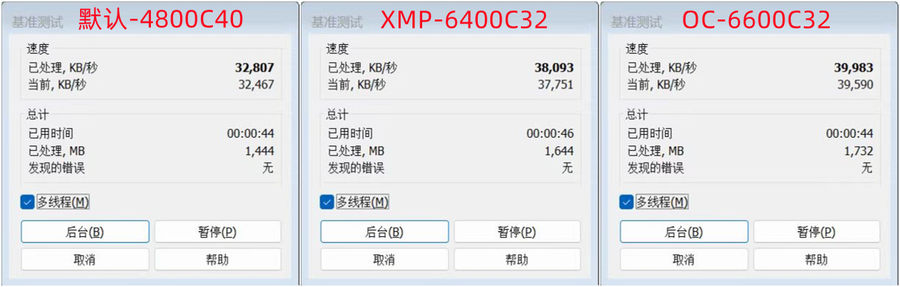 文件的压缩和解压就是典型的对内存带宽影响较大的应用,可以看到在开启XMP后,其处理速度从32807KB/s提升到38093KB/S,手动超频至6600MHz的处理速度更可接近40000KB/s。