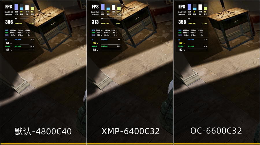 游戏方面,像对内存的延迟比较敏感《绝地求生:大逃杀》等电竞网游,内存性能提升的收益也较为明显。测试采用4K三极 致画质回放同一段录像,在默认状态下,平均258帧,1% Low为153帧;XMP状态下平均273帧,1% Low为159帧;手动超频模式平均329帧,1% Low为180帧。