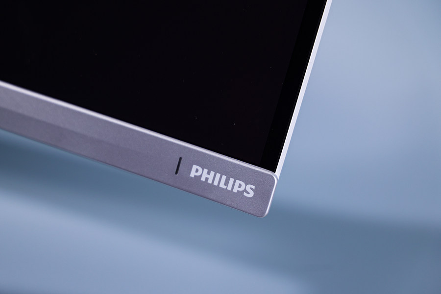 屏幕下边框右侧标有PHILIPS的字样。同时还设计有一枚白色灯效的开机指示灯,在显示器开机时会自动亮起。
