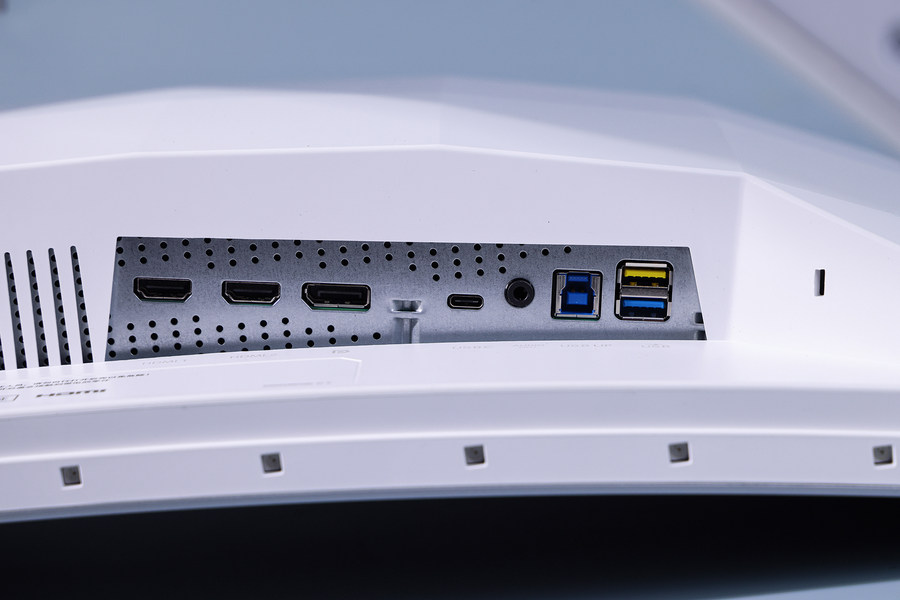 这款显示器的背面设计了电源接口,两个HDMI 2.0接口、一个DP1.4接口、一个Type-C接口、一个音频接口、一个USB上行接口、两个USB