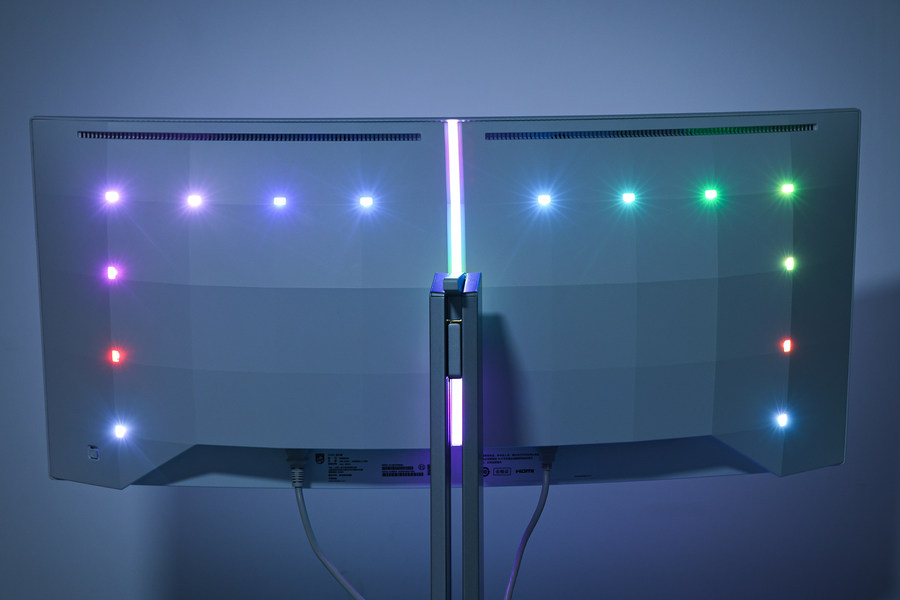 同时显示器背面还设计了游戏氛围灯,包括中间区域的一条RGB灯带,以及两侧对称式的RGB灯珠矩阵。