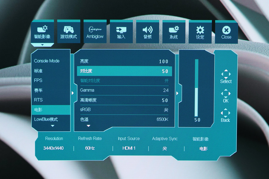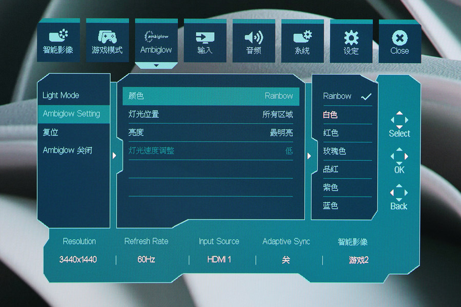 向下拨动这枚控制按键,屏幕中央位置会调出这款显示器的主控制台。可以对屏幕显示模式,各类参数,乃至显示器背面的游戏氛围灯进行详细设置。