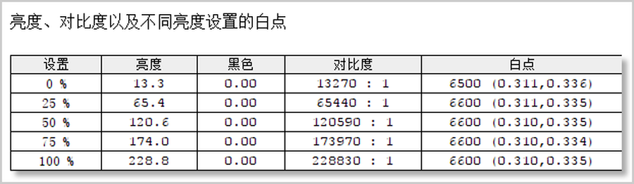 测试小结:这款显示器的色温值非常稳定,区间范围在6500K~6500K。对比度方面,这款显示器的对比度会随着屏幕亮度的增加而大幅提升。
