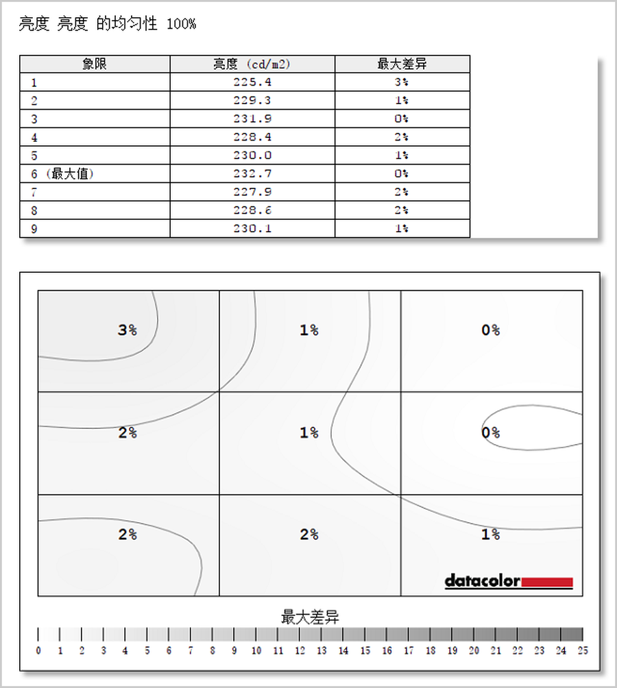 在亮度均匀性方面,在标准模式下测试,这款显示器右侧区域(6号测试区域)亮度达到了232.7cd/m2。它的左上角部分(1号测试区域)亮度偏差最大,差值达3%。