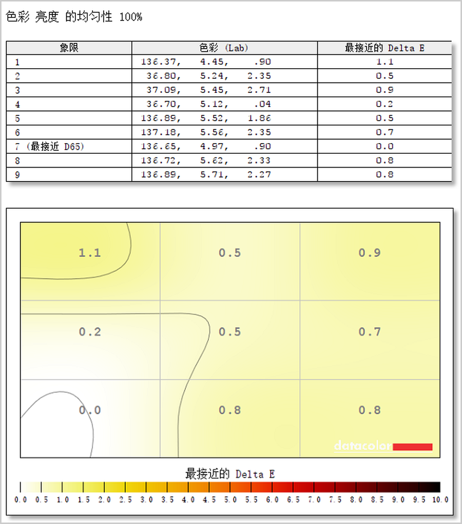 测试小结:在D65标准中,色温值为6500K表示色彩比较准确,不会出现偏冷或者偏暖。通过测试可知,标准模式下,这款显示器左下角区域(7号测试区域)最接近D65的标准。屏幕右上角区域(1号测试区域)偏差最大,差值为1.1。