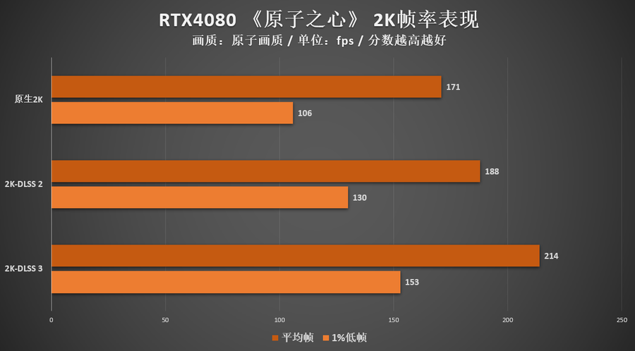 先看看2K分辨率的表现,iGame GeForce RTX 4080 16GB Advanced OC可以说是毫无压力就能带动,原生画质就已经稳定跑在了170帧左右,看来这款游戏优化还是比较不错的;开启DLSS 3-质量后,平均帧达到214帧,1% Low也有153帧,这个表现跑满2K 144规格都是绰绰有余的。