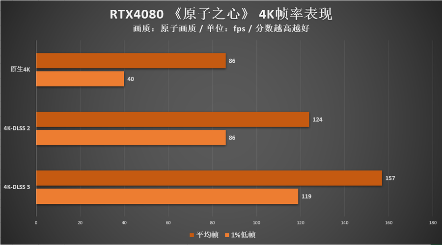 在原生4K分辨率下,尽管平均帧看上去有86帧,但是1% Low帧却出现不到60帧的情况,这代表仍然会有一些场景出现掉帧和卡顿;而在打开DLSS 2-性能模式后,平均帧率提升至124帧,1% Low也达到86帧,流畅度大有改观;接着打开DLSS 3帧生成,平均帧进一步提升至157帧,1% LOW也有119帧,也就是完全满足4K 120帧的流畅标准了。
