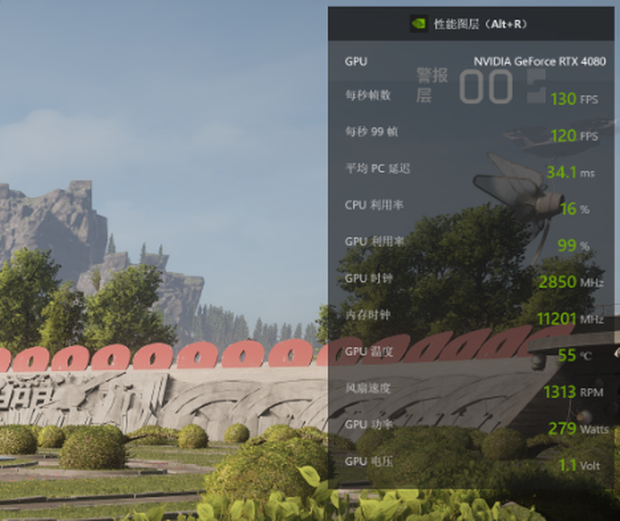 通过GeForce Experience软件监测可以看到,4K DLSS 3模式运行《原子之心》时显卡的功耗仅有280W左右,配合9热管(7*8mm+2*6mm)+真空腔液冷底座的豪华散热规格,让iGame GeForce RTX 4080 16GB Advanced OC这款显卡在运行4K《原子之心》时仍然时刻冷静,GPU满载核心温度只有55°C,风扇也保持在1300转的中低转速,运行体验良好。