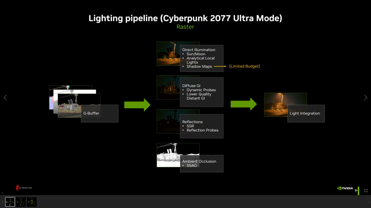 全景光线追踪能够对几乎任意数量的自发光光源的光线属性进行建模,在所有物体上形成物理正确的阴影、反射和全局光照。在《赛博朋克2077》中,大量的霓虹灯、LED广告牌和光照反射物体将会使得全景光线追踪的效果更加突出。