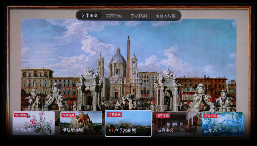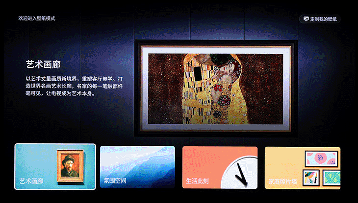 就笔者个人而言,大多数时间更中意“艺术画廊”模式,在待机的情况下,可以让电视变成私人画廊,艺术画廊模式精选涵盖了西方古典、中式山水、现代抽象等不同风格的世界名画供我挑选展示,画作可以随意切换并可搭配不同风格和颜色的衬布、画框,让电视变成一幅挂在墙上的装饰画,为家增添艺术感。