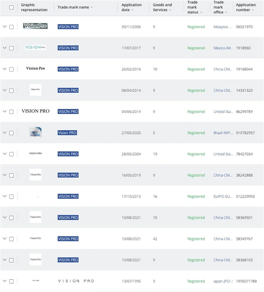 最近有关“Vision Pro”商标权,引来网友的关注,毕竟华为4年前就已注册,不过让苹果更头疼的是,这个商标其他国家也早已被提前注册。有外媒发现,不少国家已有数百份关于“Vision Pro”的商标申请,其中有些已获得批准且依然生效、有些则是批准但过期、还有一些仍在等待审核中。从大部分申请的标准看,基本涵盖产品都是跟苹果的Vision Pro重叠,这也让它的发售阻碍不断。