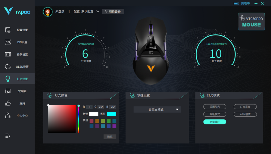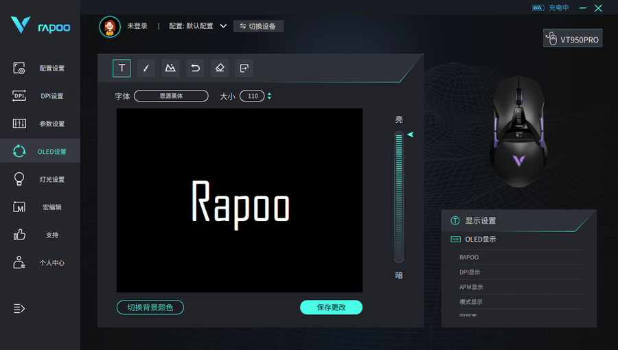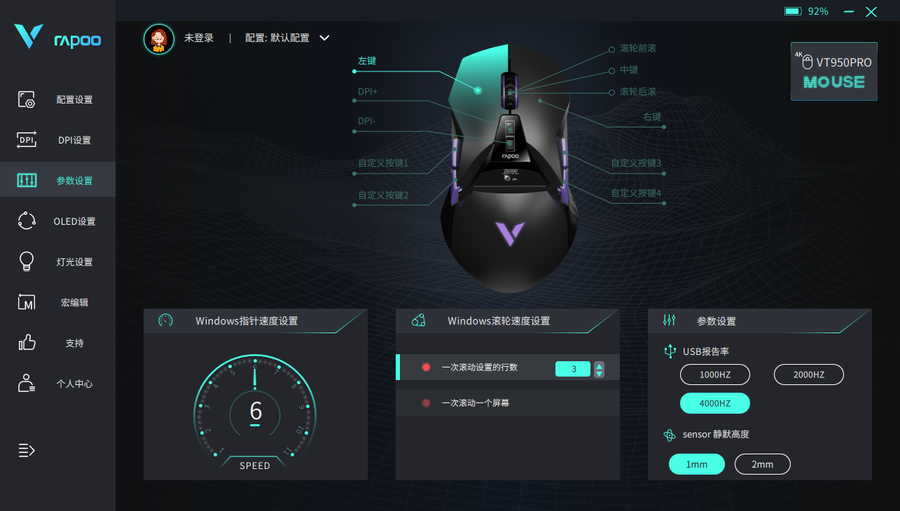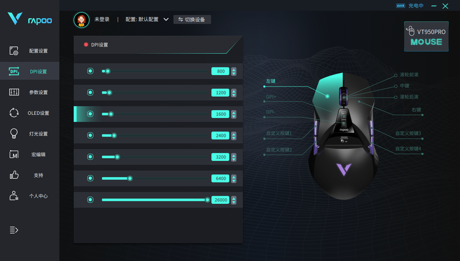 雷柏VT950 Pro屏显双模无线游戏鼠标可通过这一个驱动进行到相关的设置,包括DPI的更改、按键的自定义等等。除此之外,雷柏VT950 Pro屏显双模无线游戏鼠标还得以通过这一个驱动进行到OLED屏幕、灯光的方面的设置,打造更具个性化的外观呈现。