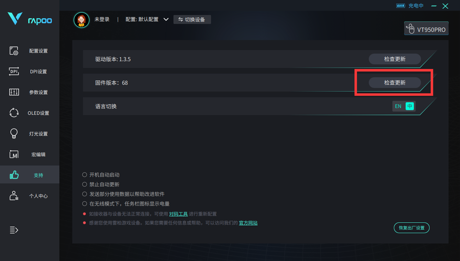 在配对之前,我们需要在驱动内对雷柏VT950 Pro屏显双模无线游戏鼠标进行固件的升级,在升级完成后即可按照相关操作进行两款设备间的配对。