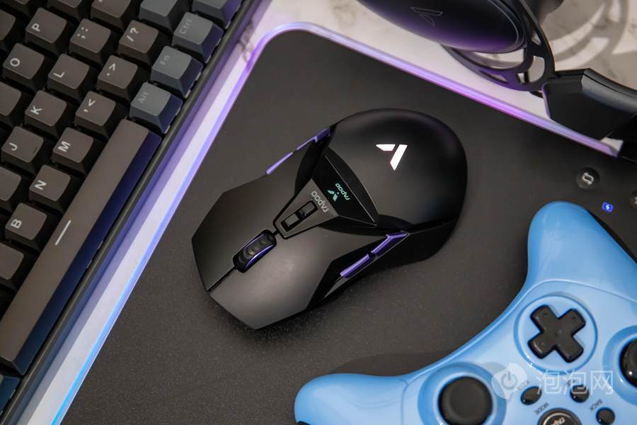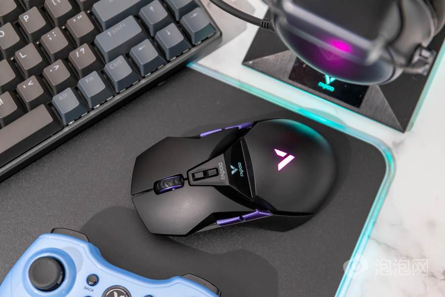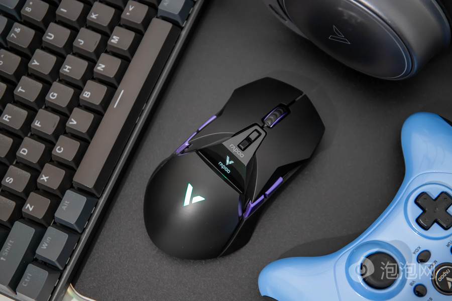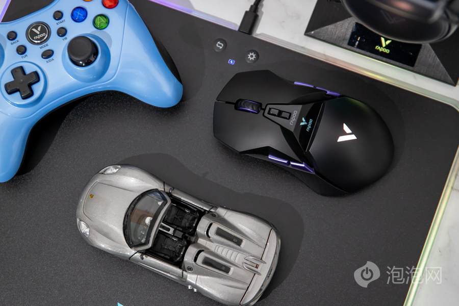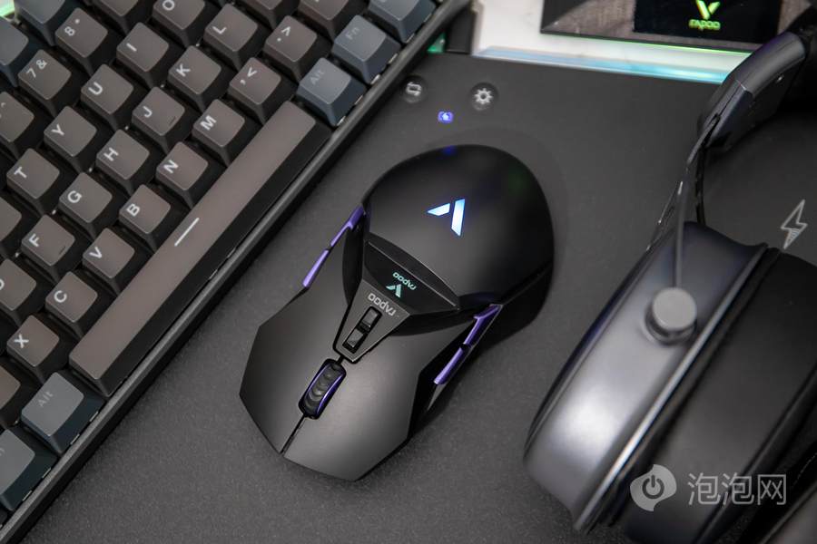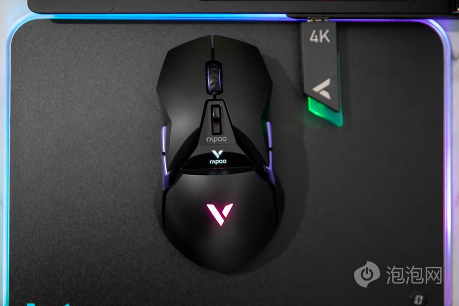 在鼠标顶面的中部,雷柏VT950 Pro屏显双模无线游戏鼠标配备了一块客制化OLED屏幕,可以显示鼠标相关参数或者让用户自行设置内容进行显示。而在鼠标的掌托部分,雷柏VT950 Pro屏显双模无线游戏鼠标加入了雷柏的透光LOGO,内具有1680万色的LED灯光,可提供多种不同的灯光方案。这客制化的OLED屏幕以及多彩的灯光效果,结合鲜明特点的外观,为用户打造个性化游戏装备提供了全新的解决方案。
