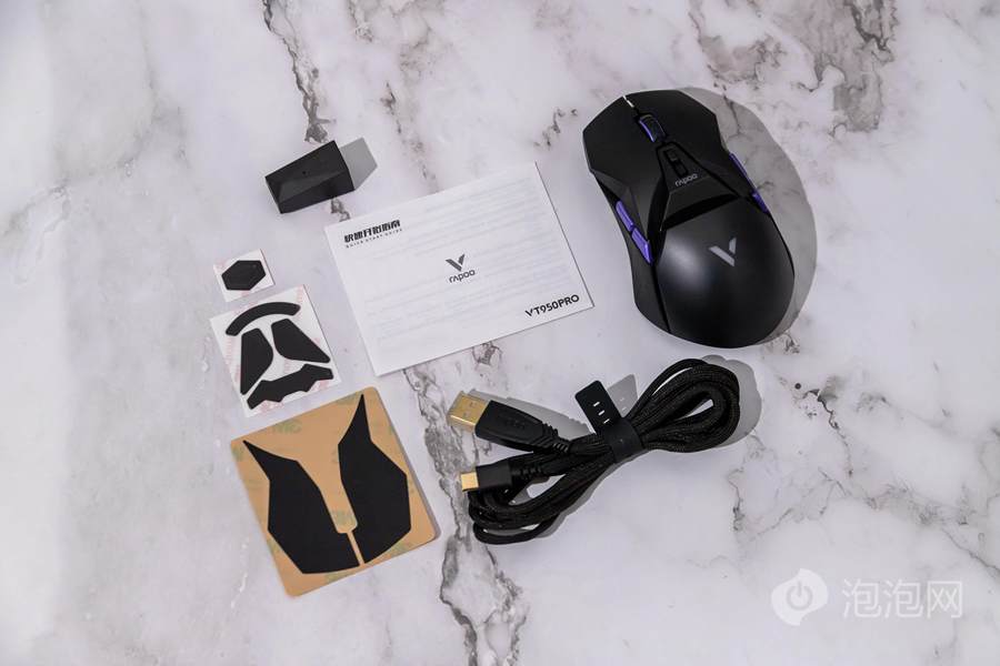 去除包装,我们可以看到雷柏VT950 Pro屏显双模无线游戏鼠标的本体、说明书、一根1.8M的伞绳USB-C数据线、USB-C转USB-A的无线接收器延长座、替换的特氟龙脚贴、鼠标防滑贴,而鼠标自带的2.4G无线接收器则以磁吸的方式收纳于鼠标的底部。从一系列附带的配置来看,到雷柏VT950 Pro屏显双模无线游戏鼠标的定位可以说是相当高端了。