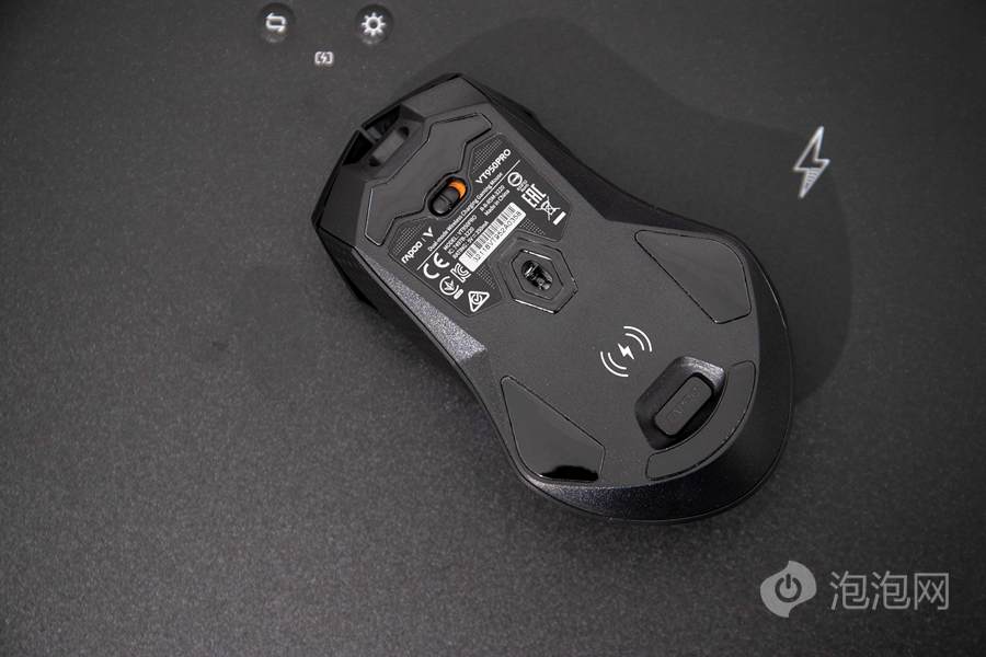 雷柏VT950 Pro屏显双模无线游戏鼠标底部配备了大面积的特氟龙脚贴,可以为用户的操作带来更为顺滑的手感。除此之外,我们可以看到雷柏VT950 Pro屏显双模无线游戏鼠标在底部还有开关、传感器开孔以及相关的Qi无线充电区域。