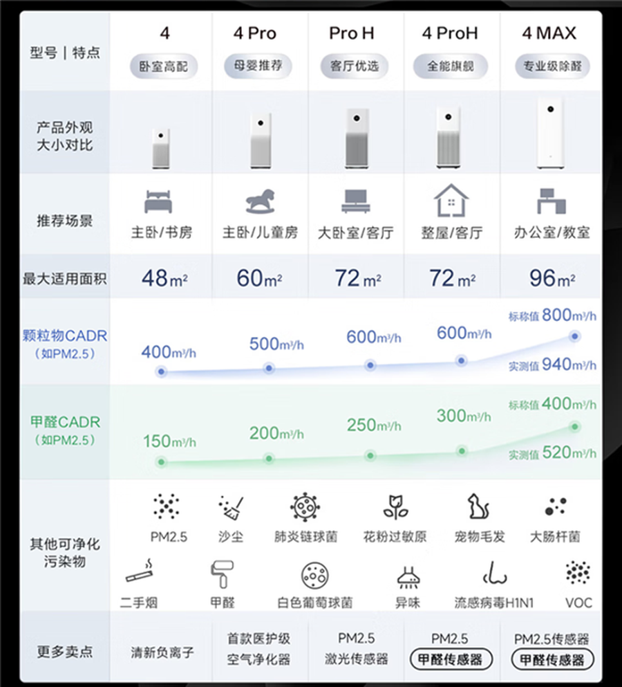 米家空气净化器4 Pro H是2000元内极少拥有甲醛数显的产品,可以显示家中甲醛浓度,精度可达0.001mg/m3。同时还支持99%除醛,配备活性炭、高分子纳米反应剂等,可将甲醛彻底分解,TVOC 1小时去除率可达99.4%。其采用六层复合滤芯,具备抗菌抗病毒双涂层,同时配备紫外UV实时消杀,高效灭菌毒,滤芯寿命达10-14个月,每天仅需0.84元。官方称每分钟可输出10000L 洁净空气,3小时进化一间大卧室,适用面积为42-72㎡。