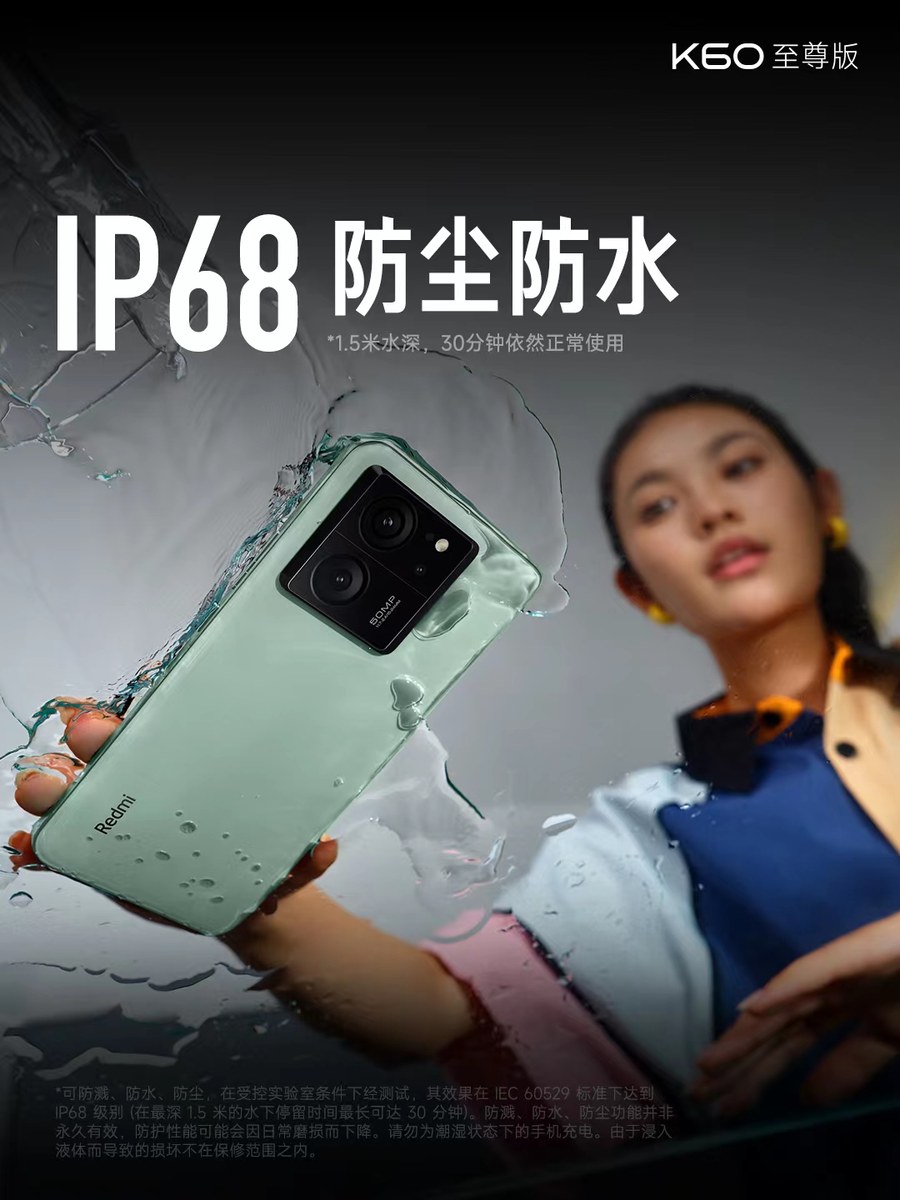 K60 至尊版还带来了一项同档罕见的越级体验,支持IP68等级防尘防水,1.5米水深静置30分钟依然可正常使用,避免意外落水造成损坏,户外使用更安心。充电方面,K60 至尊版采用自研澎湃P1+澎湃G1组成的双芯快充方案,120W高功率仅需19分钟即可将5000mAh电池充至100%。并搭载澎湃电池管理系统,提升电池安全性与耐用性。此外,X轴线性马达、立体声双扬声器、多功能NFC、屏下指纹等旗舰配置,K60 至尊版也悉数配齐。