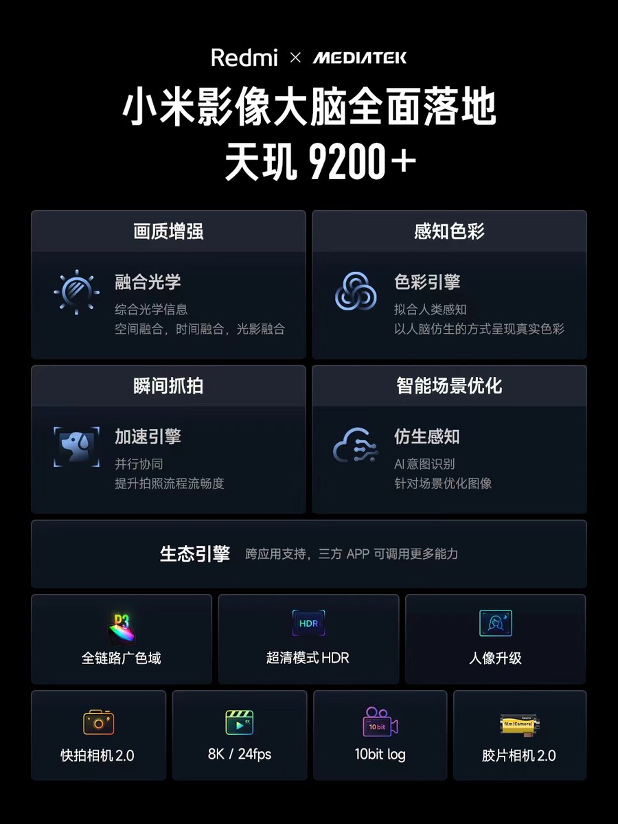 画质方面,Redmi首次在天玑平台落地超清HDR算法,大幅提升画面动态范围,优化超清模式下的画质表现。人像模式也实现了超级夜景、HDR算法的兼容支持,配合人像超清功能,对被摄人物面部进行画质与细节增强,带来全场景的出色人像拍摄体验。另外,得益于狂暴引擎2.0的系统级优化,K60 至尊版还实现了8K/24帧高规格视频不限时长录制,并支持HDR10+及10bit log视频拍摄,配合同步升级的MI剪辑,可叠加多视频轨道、导入自定义LUT,增强视频专业能力。