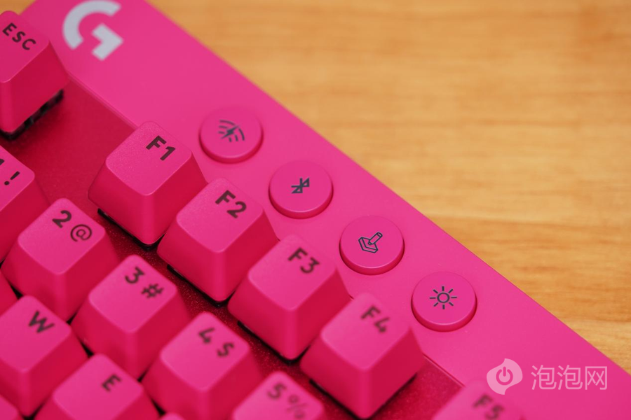 罗技PRO X TKL LIGHTSPEED也配备了丰富的功能按键,便于用户快速对键盘进行设定。左侧的四个按键分别是LIGHTSPEED配对键、蓝牙配对键、游戏模式按键以及键盘背光灯按键。