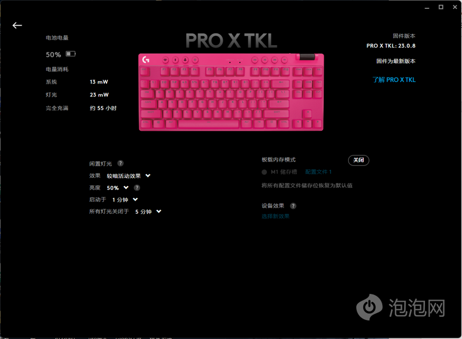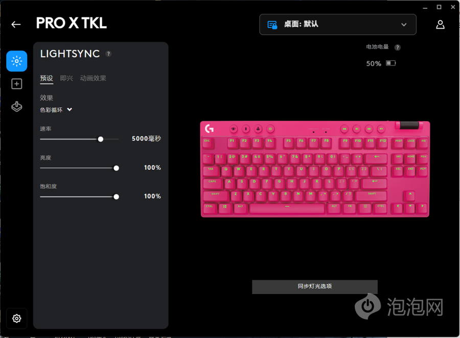 罗技PRO X TKL LIGHTSPEED也可以连接G HUB,在软件中集成了LIGHTSYNC灯光控制系统,可以修改键盘的背光亮度、颜色以及动画效果,键盘支持约1680万色,你可以选择自己喜爱的配色来装点你的键盘。