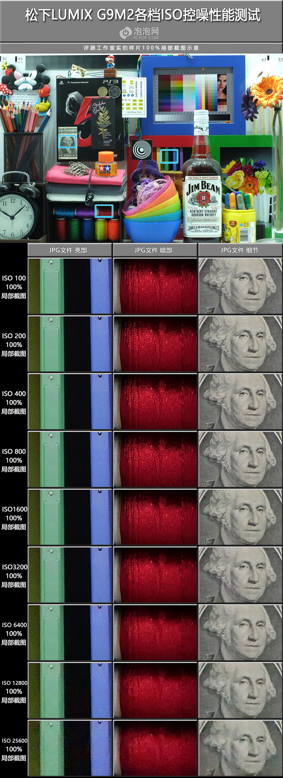 从上面的截图对比可以看到,松下LUMIX G9M2在ISO 100-800的低感光是表现非常优秀,画面纯净细腻,并且细节还原的很扎实。感光度提升至ISO 1600后画面细节稍有下降,但依然还是能很清晰的看见纸币上人脸的纹理以及线团的质感。当ISO提升至ISO 3200时的暗部画质下降,但暗部也没有明显噪点或杂色出现,ISO 6400后细节变得更加模糊了,但由于采用了新传感器和图像引擎的LUMIX G9M2在控噪上表现依然非常厉害,噪点控制的很不错。所以综合来看,松下LUMIX G9M2在感光度ISO 3200以内都可用,如果不看100%放大只看缩略图的话ISO 6400的画质也没有问题,对于一款M4/3画幅的相机来说已经非常不错了。