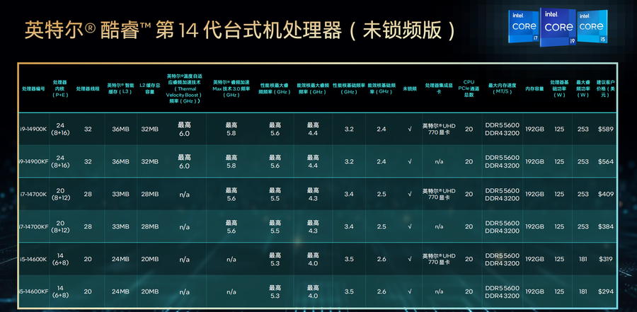从上面这两张英特尔官方给出的处理器规格列表来看, 酷睿14代对比酷睿13代主要有两大差异: