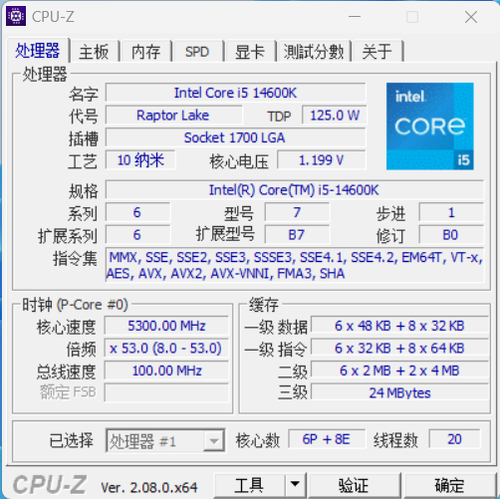 酷睿i5-14600K采用6+8核心、20线程设计,默认睿频高达5.3GHz,二级缓存容量为20MB,三级缓存容量为24MB,TDP为125W。