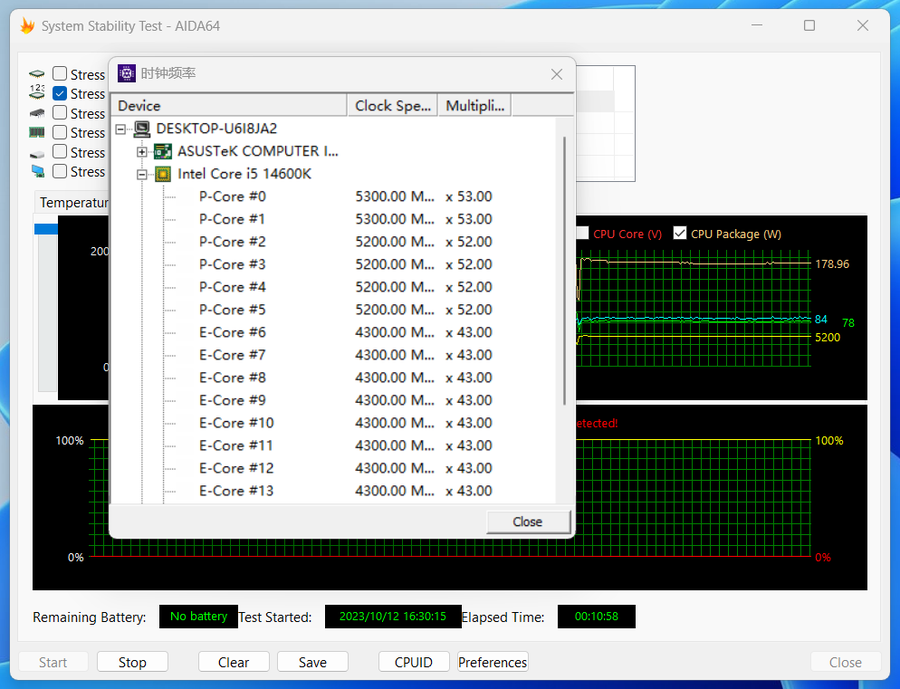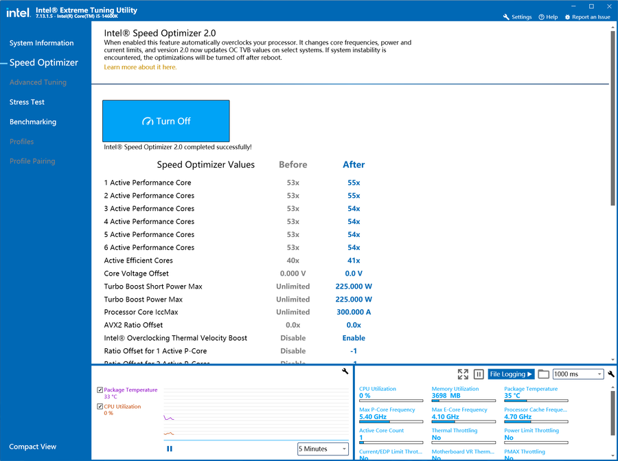 开启英特尔XTU“一键自动超频”功能之后,笔者手中的这颗酷睿i5-14600K,将2个优质核心睿频提升至5.5GHz,性能核全核心睿频提升至5.4GHz,能效核全核心睿频频率提升至4.1GHz。