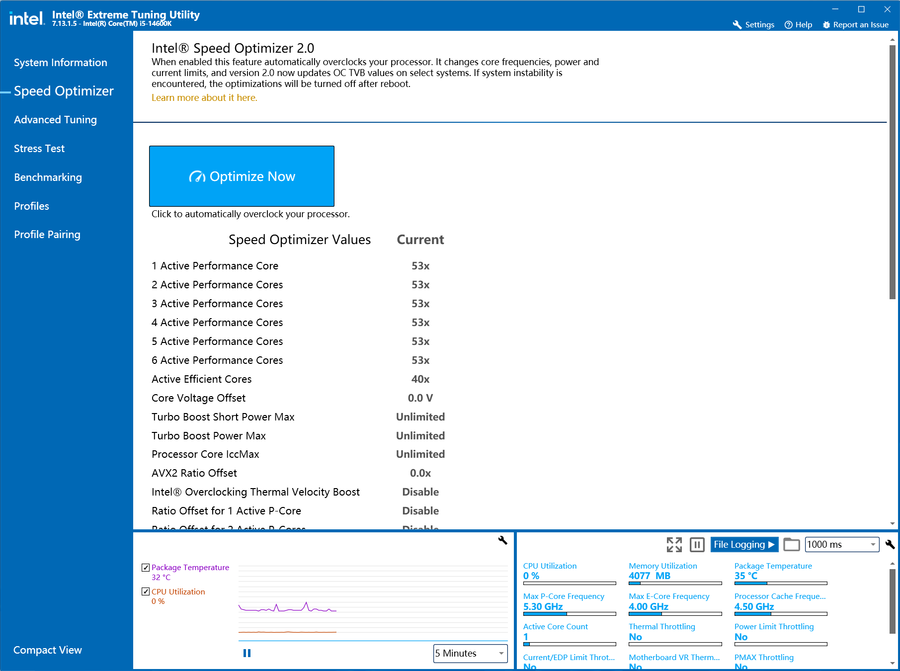 启动英特尔XTU这款软件,在Speed Optimizer界面下,点击醒目的“Optimizer Now”按钮,便会进行一键自动超频。