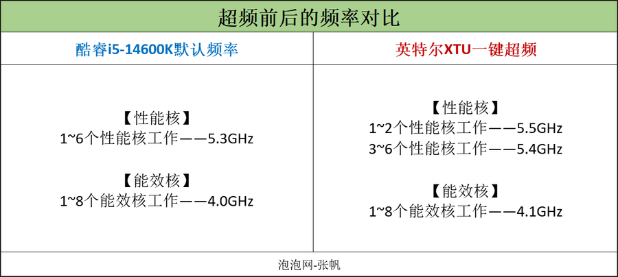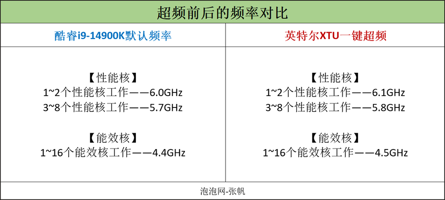 关于酷睿i9-14900K处理器和酷睿i5-14600K处理器加载XTU一键自动超频之后的结果,笔者列出了一张频率对比表格。(CPU的详细频率可以直接利用英特尔XTU这款软件识别。)