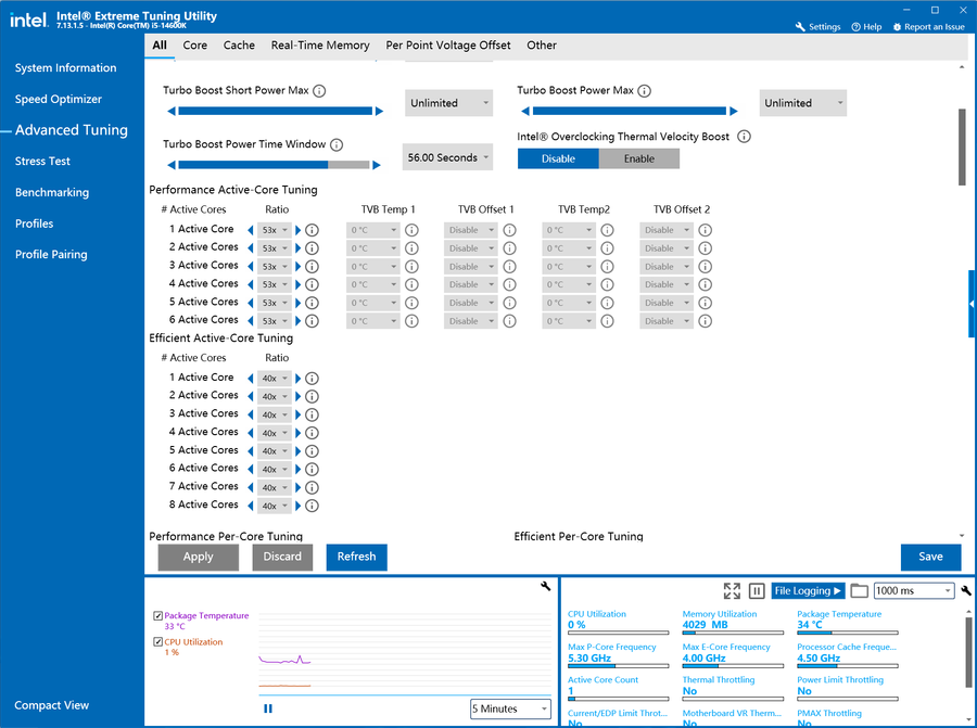 除了"一键自动超频"之外,玩家们还可利用英特尔XTU这款软件手动去进行动态超频。打开英特尔XTU这款软件,切换到“Advanced Tuning”界面,便可以对处理器进行手动超频操作。