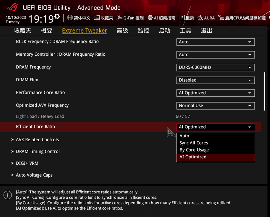 在主板BIOS中找到“Efficient Core Ratio”选项,然后选择“AI Optimized”设置,AI智能超频便会在系统重启后自动开启。