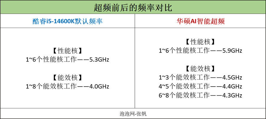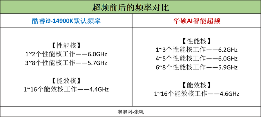 关于酷睿i9-14900K处理器和酷睿i5-14600K处理器加载华硕AI智能超频之后的结果,笔者列出了一张频率对比表格。(CPU的详细频率可以直接利用英特尔XTU这款软件识别。)