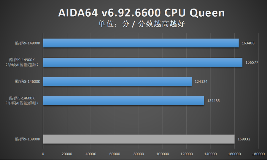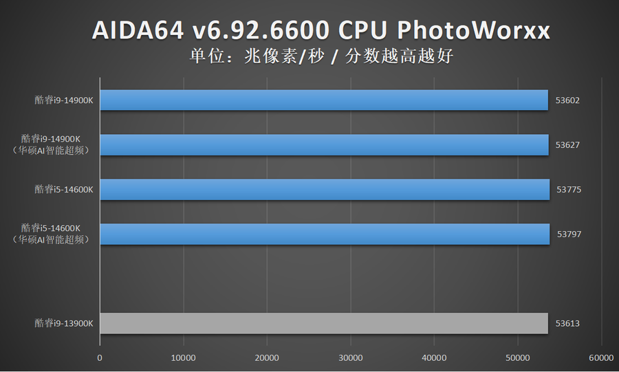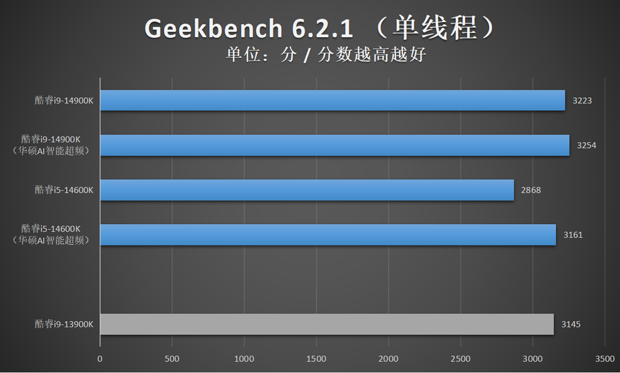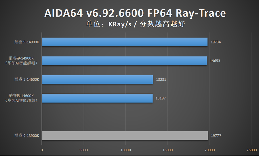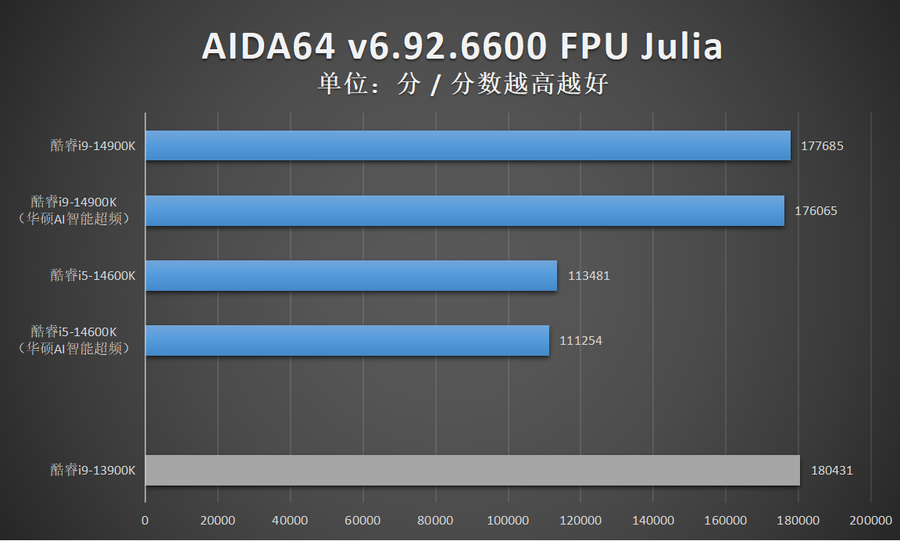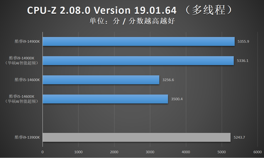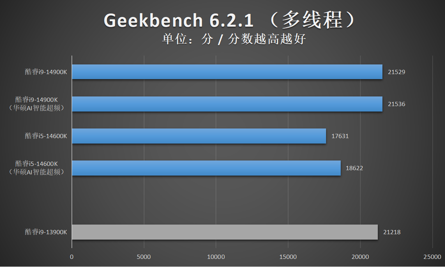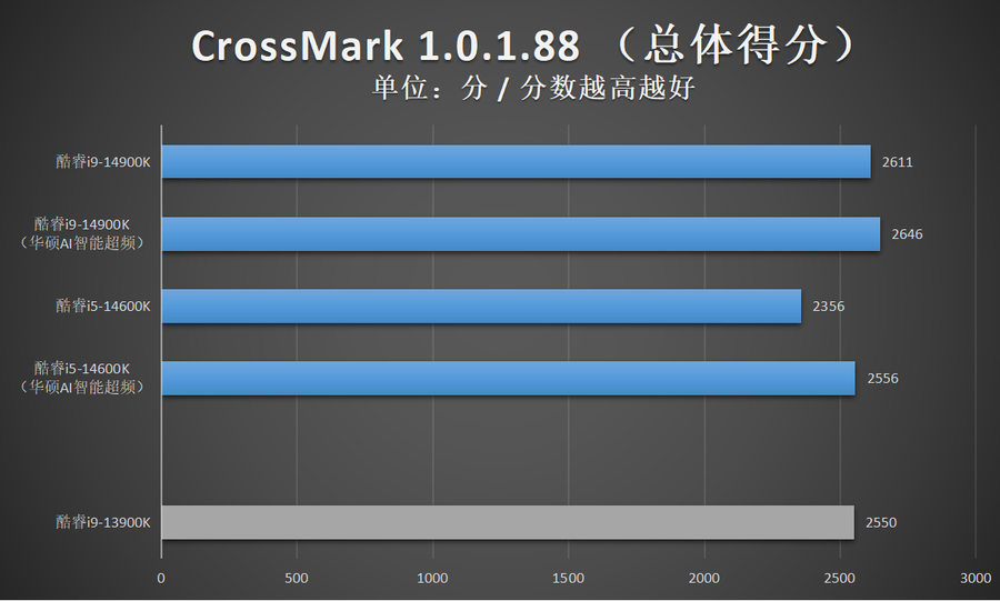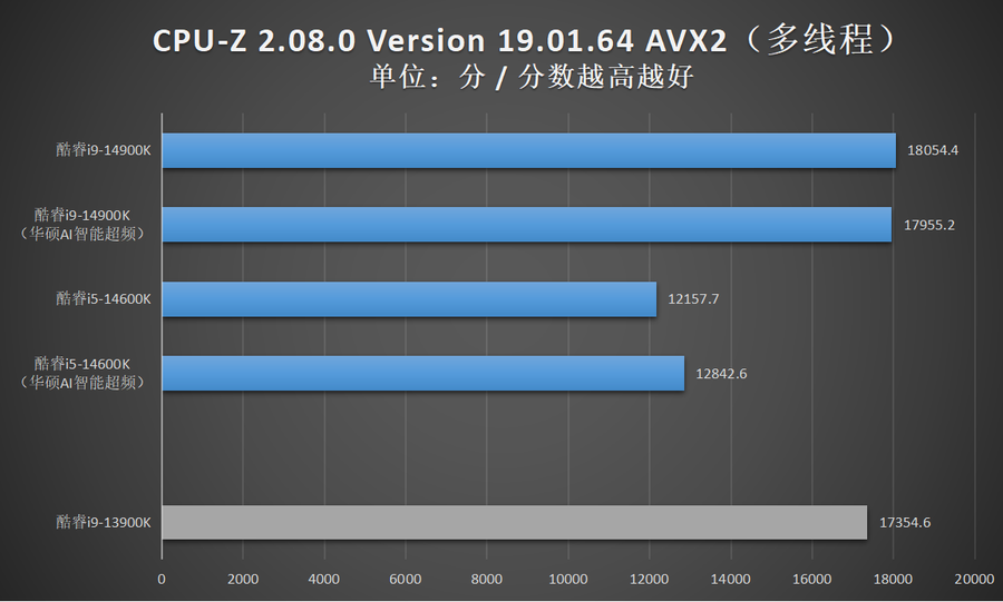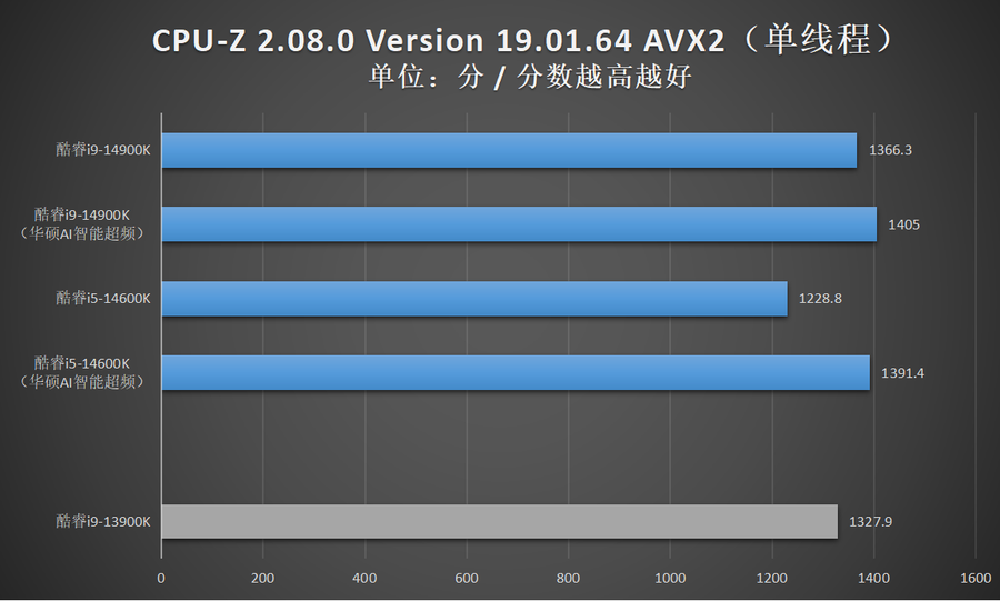 由于华硕AI智能超频相比XTU一键自动超频的超频幅度更加显著,因此笔者还特别加入了酷睿14代在开启华硕AI智能超频的性能成绩。