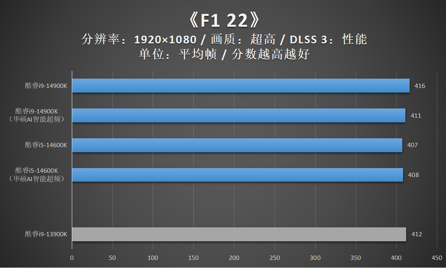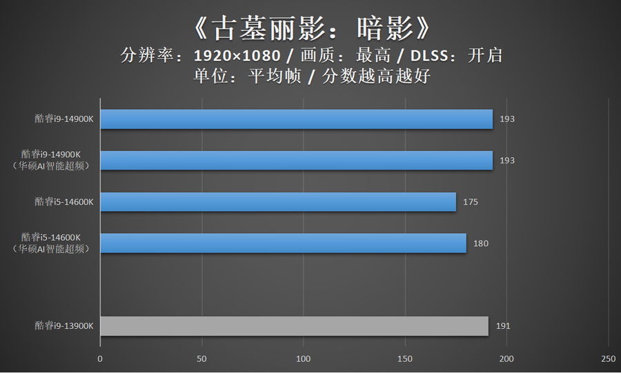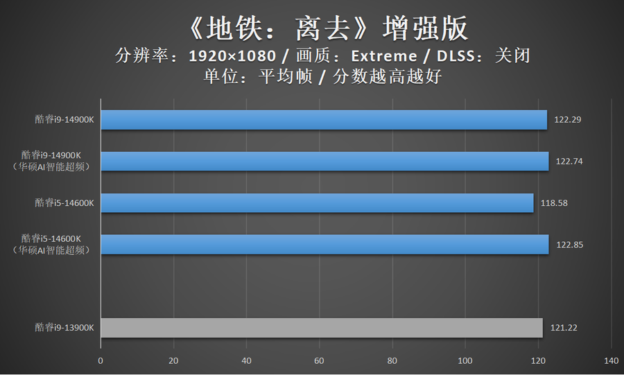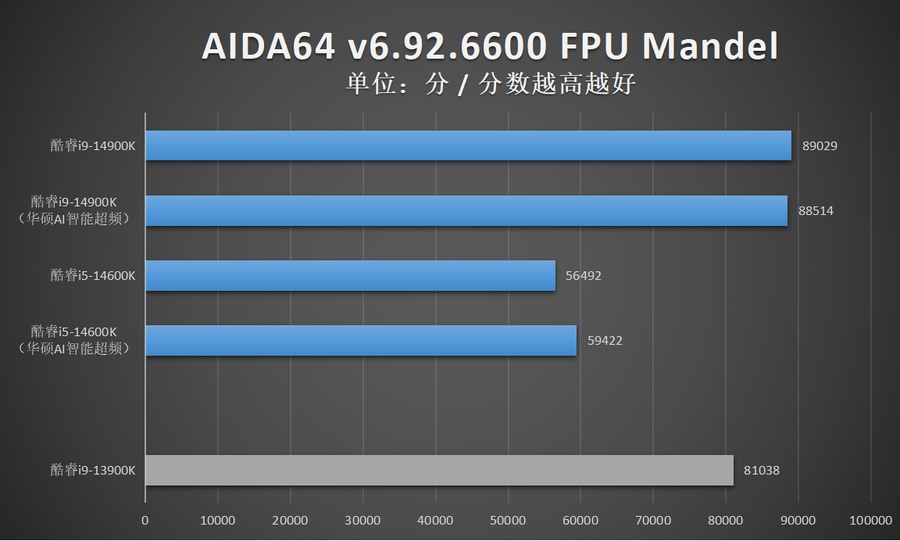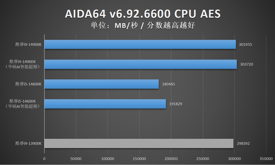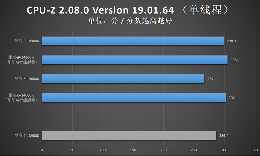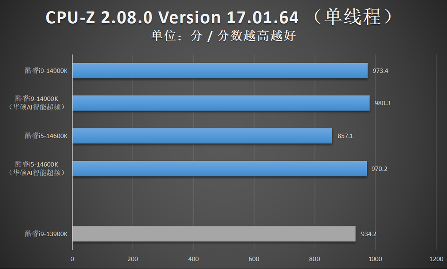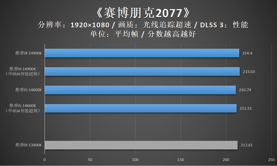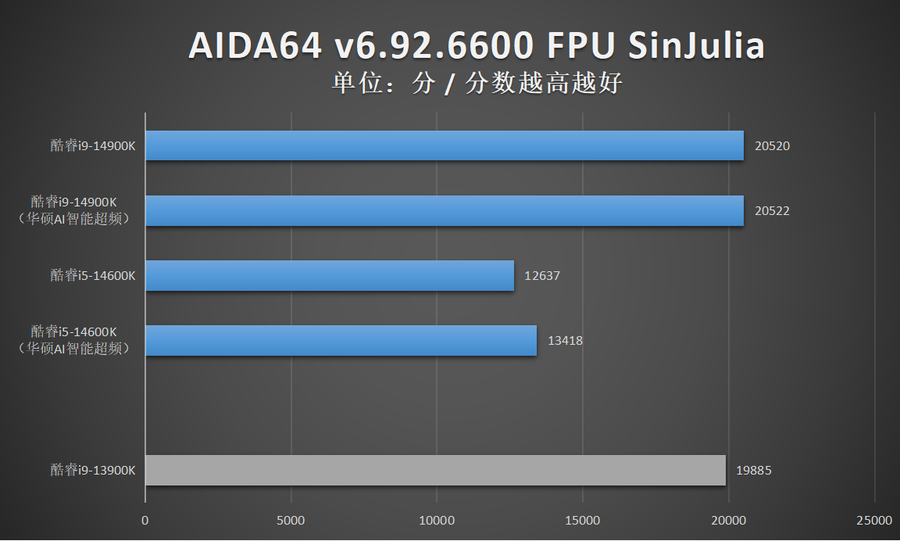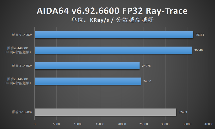 由于华硕AI智能超频相比XTU一键自动超频的超频幅度更加显著,因此笔者还特别加入了酷睿14代在开启华硕AI智能超频的性能成绩。