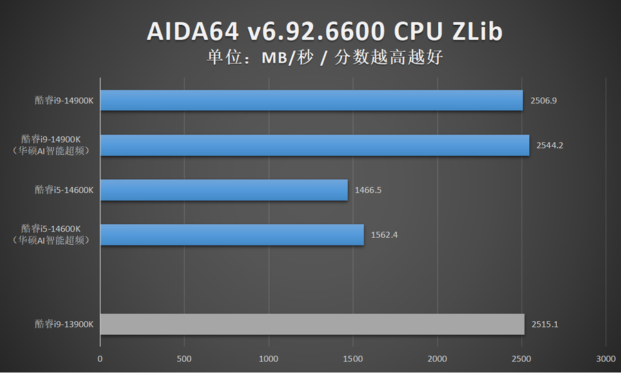 注意,酷睿i9-14900K超频之后,在部分性能测试当中出现了性能倒退,笔者认为应该是酷睿i9-14900K发热量过高,频率下降,导致性能发挥不稳定。