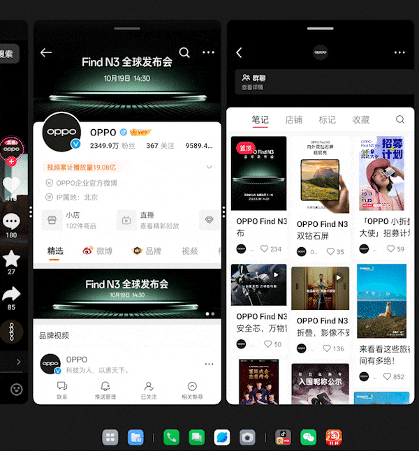 OPPO Find N3针对大屏的多任务体验也进行了优化升级,带来了非常丰富的多任务模式,除了传统的双应用分屏模式外,OPPO Find N3还带来了超视野全景虚拟屏的多任务模式,从而实现3个应用同时运行的体验。
