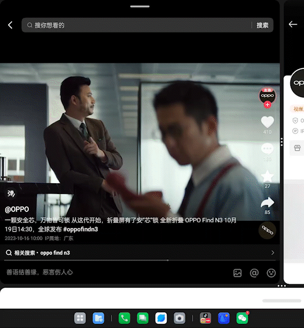 OPPO创新的提出了应用“候场”的概念,正在运行的“前台”应用可以充分利用大屏呈现完整的界面及体验,而候场的应用则仅露出界面边缘,可以通过点击候场应用的界面来实现快速切换。