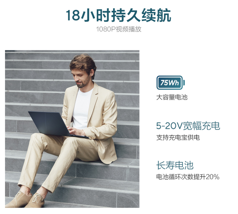 轻薄机身内搭载了75Wh大容量电池,提供18小时持久续航,同时采用快充模式+长寿电池的组合,电池循环次数提升20%,39分钟快充至50%电量,让灵耀14在使用时场景不局限、时间不受限,断电移动办公也不焦虑。