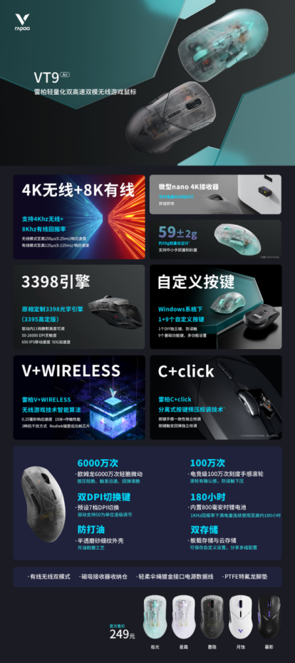 搭载着雷柏V+无线游戏技术,产品力、品牌力为一身的VT9Air——拥有4K无线+8K有线电竞游戏技术,并使用了雷柏科技与原相科技共通校调的旗舰级原相定制3398光学引擎(3395高定版),通过升级驱动软件版本、鼠标本体以及接收器固件后,性能有所优化,同时可以开启11档静默高度驱动可选的功能。