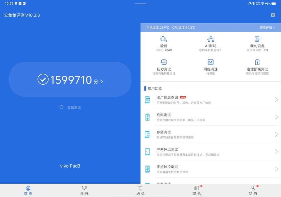 在安兔兔跑分中,我们这台vivo Pad3取得了1599710分的成绩,和一些搭载同款芯片的手机表现相当。