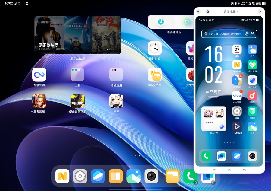 vivo Pad3还具备全面的多设备互联功能,在控制中心可以一键操作与登陆同一账号的手机、电脑等设备进行互联,省去了在不同设备上设置的麻烦,还可以进行跨设备投屏,拖动即可完成文件、照片的传输。