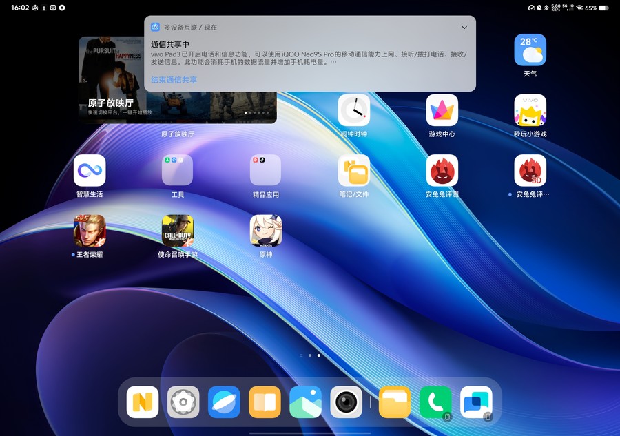 而且vivo Pad3还可以调用手机的5G蜂窝网络,只需将平板靠近手机即可自动连接,无需手机端开启移动热点,功耗更低。除了共享上网外,还能接打电话,收发短信,四舍五入相当于拥有了一个“蜂窝版”平板。