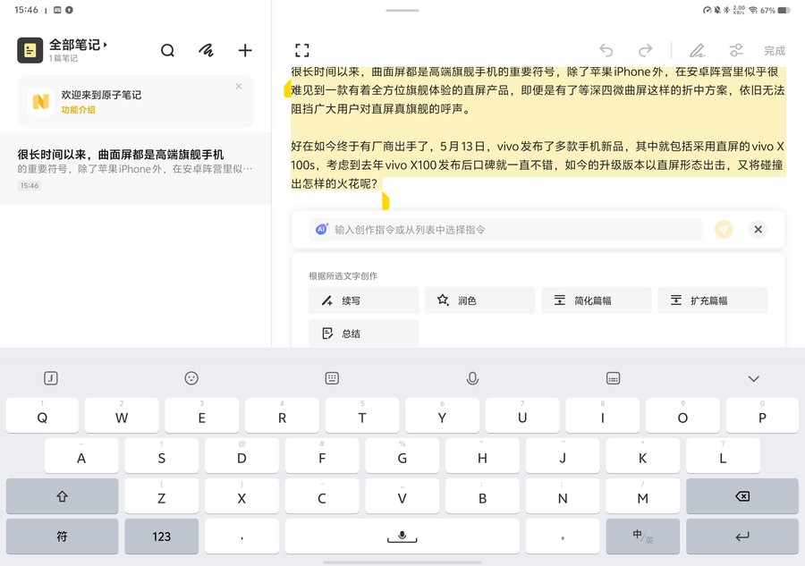 原子笔记现在也可以调用蓝心大模型的能力,用户无需将内容复制到蓝心小V,就可以直接在笔记页面通过AI对笔记内容进行润色、续写等操作,还可以设定更为详细的文字风格,如小红书文案、微博文案等。
