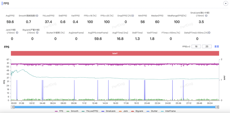 在《原神》中我们开启极高画质和60帧模式,经过半小时跑图测试测得平均帧率59.6FPS,整体表现也较为流畅,没有出现大幅的卡顿掉帧。