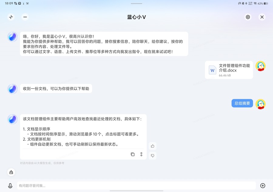 比如“蓝心小V”智能助手,除了简单的问答外,还支持文案生成、图片生成,并且支持文字输入、语音输入,还可以发送图片和文档进行进一步分析解读。