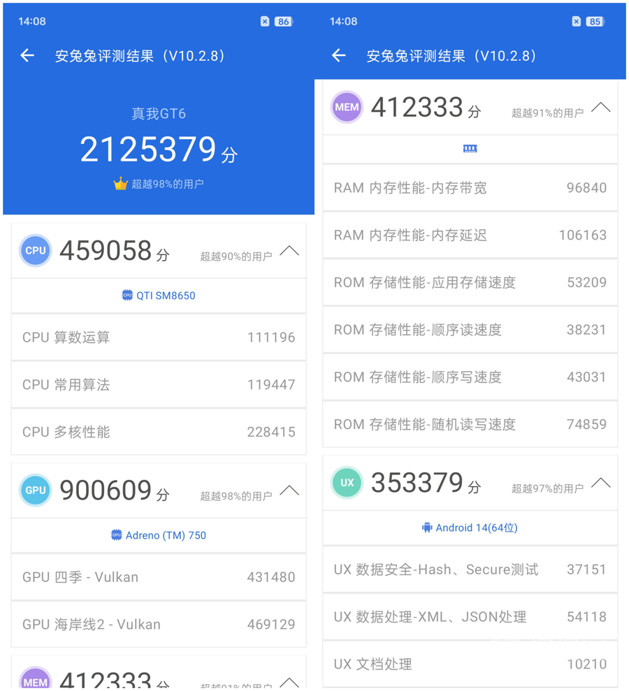 经过安兔兔测试,真我GT6的最终成绩为2125379分,属于旗舰手机的第—梯队。